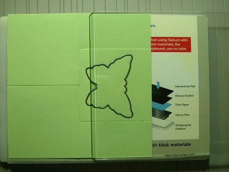 Make your card base in the same way as Version I  above using cardstock cut to 6" x6". Score at 3" for the middle of the card and make the tabs either side 1.5" wide.  In the middle section place your die cut  half an inch from the middle score line and then put through your die cutting machine placing  the Top cutting plate leaving a quarter of an inch of the die clear.