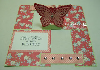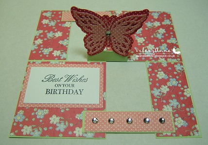 On the decorated card below the butterfly has been additionally cut out using a spotty design paper and adhered to the base card with a further layer added in a contrasting  spotty paper. N.B.  The die cut used  is in two pieces. 1 plain outline and the second die shape has a design cut into the wings.